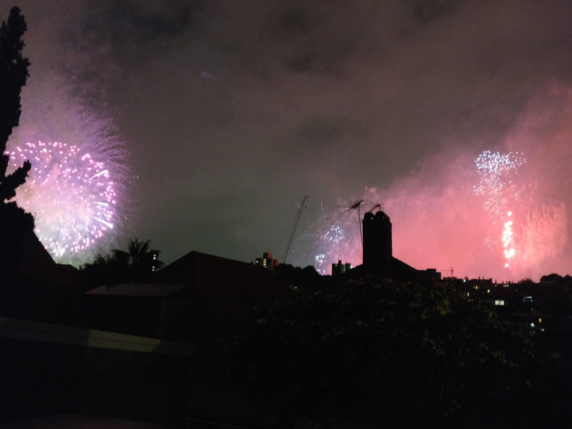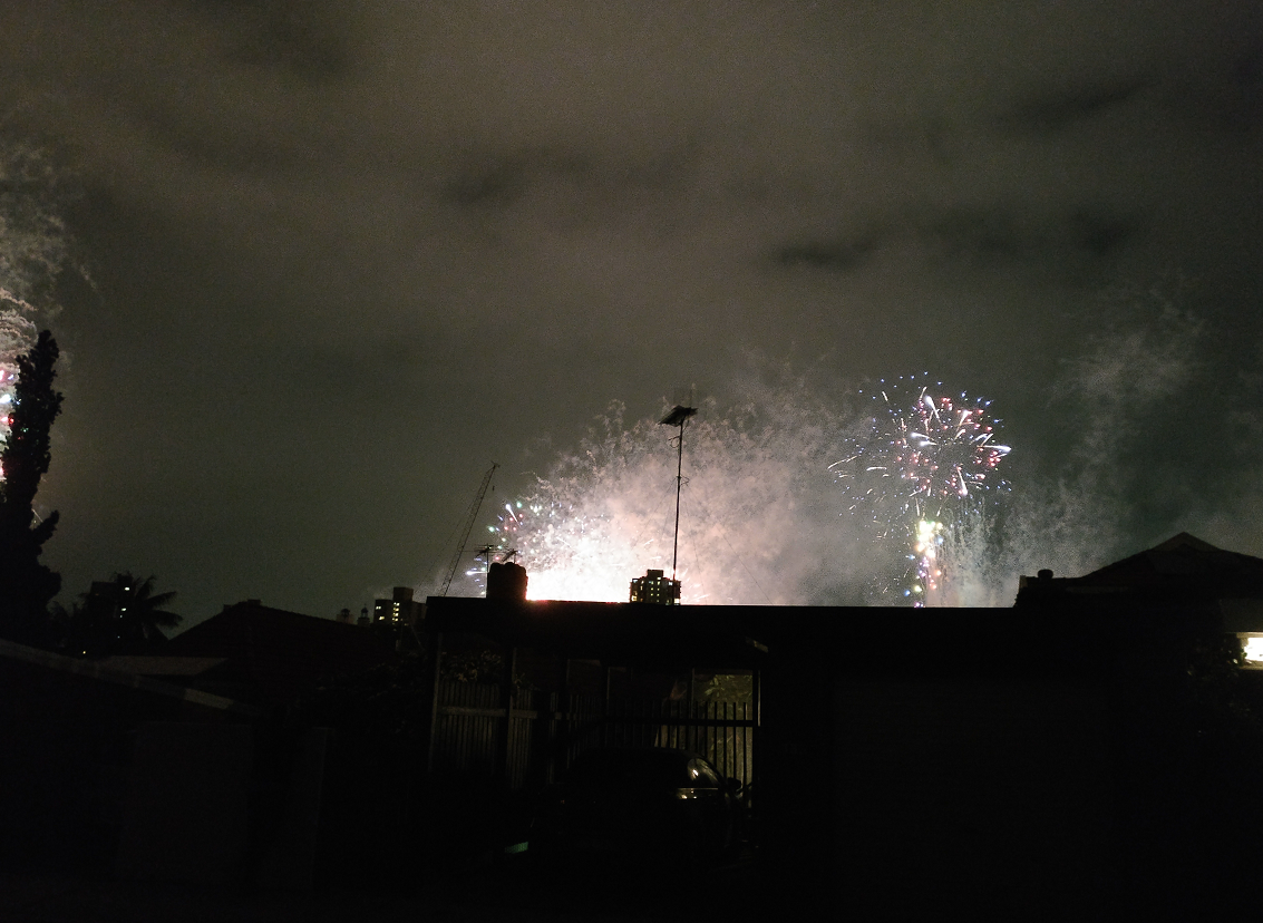 This park unfortunately does not provide a good view of fireworks, so we had to embark on a short walk up the hill - towards neighboring streets where a glimpse of NYE show can be cought: